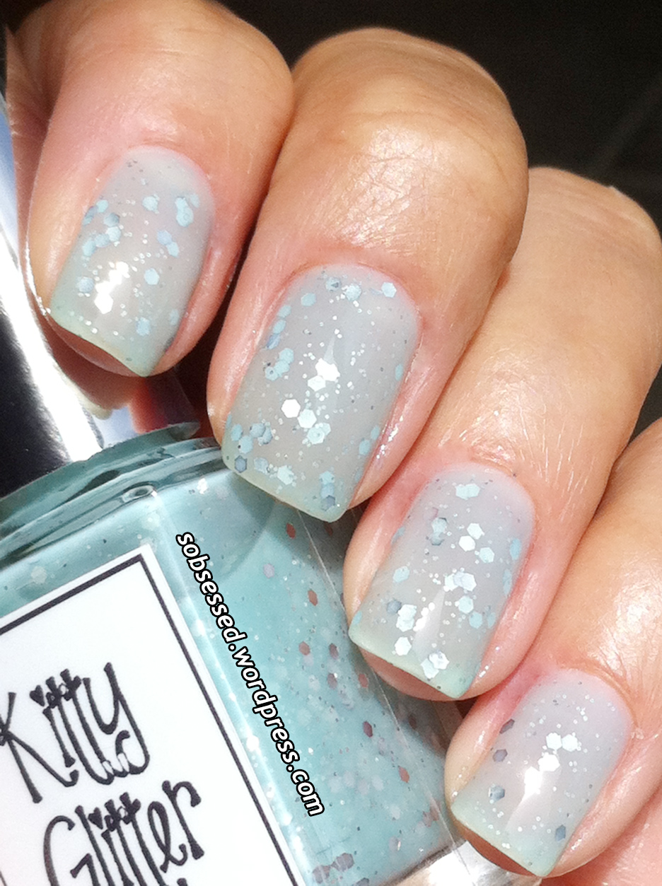 Today I have for you Kitty Glitter, another polish from Whimsical Ideas by Pam. This is a beautiful pale blue polish with medium-sized silver hex and tiny silver glitter.